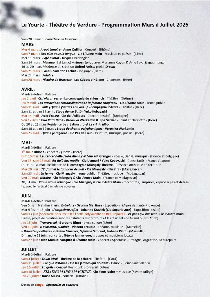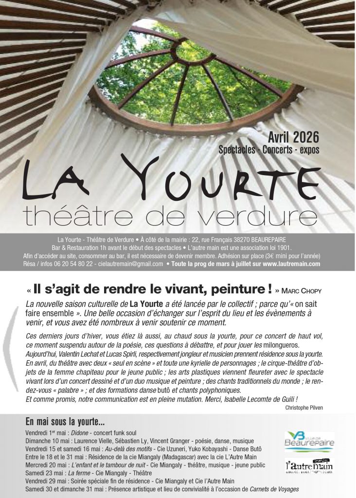 La yourte de la compagnie L’Autre Main est en résidence au Théâtre de Verdure du 28 février au 31 juillet 2026, accueillie par la commune de Beaurepaire